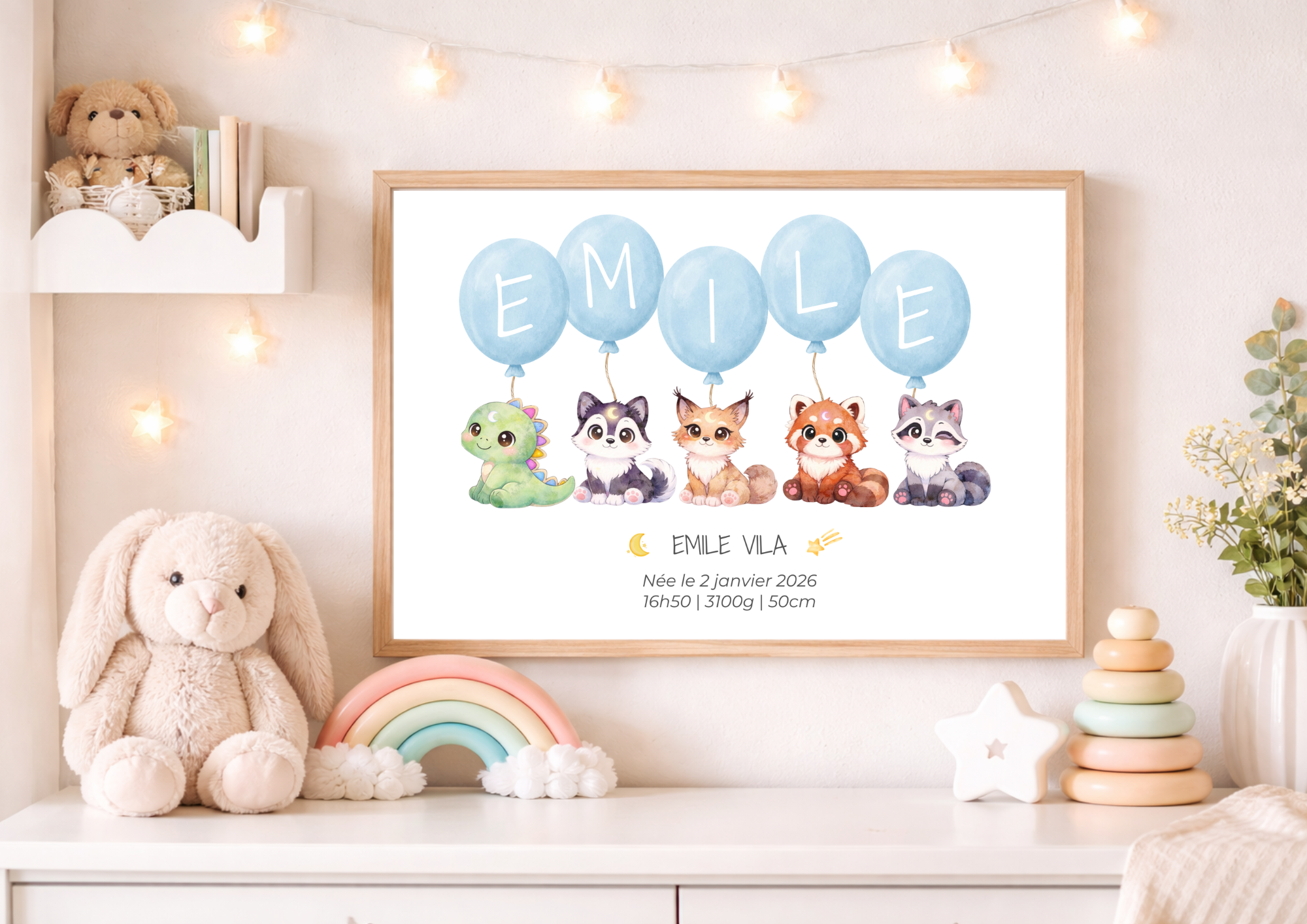 Personnalisez votre affiche avec le prénom, la date, l’heure, le poids et la taille de naissance.