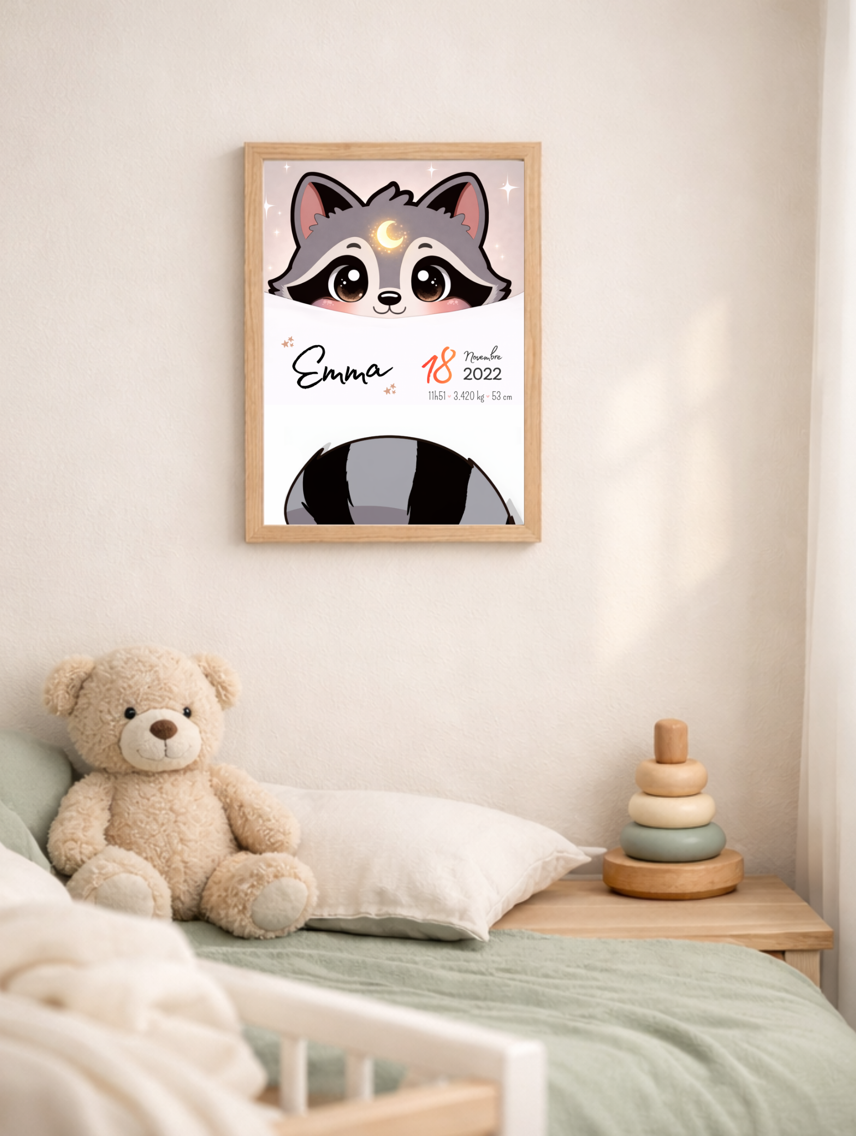 Affiche raton laveur personnalisée | Prénom & détails de naissance | Illustration originale