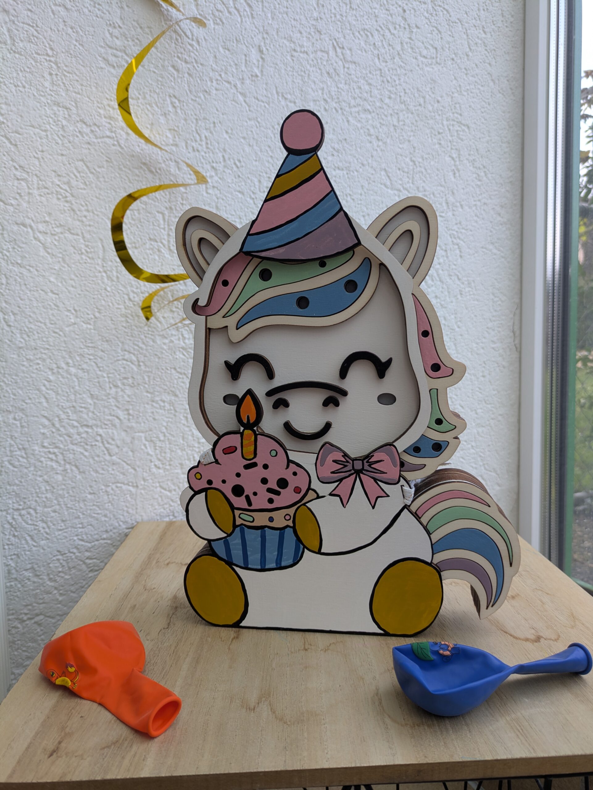 Le Costume Anniversaire de la Licorne Rêveuse est parfait pour insuffler une ambiance joyeuse dans la chambre de votre enfant ou pour décorer un coin fête.