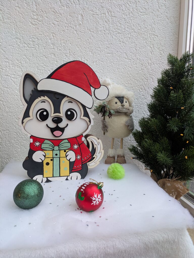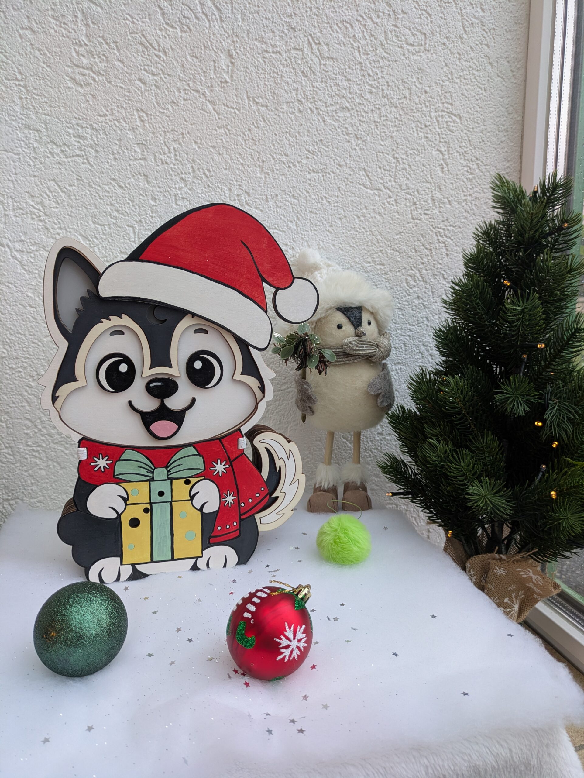 Le Costume Husky Noël ajoute une touche chaleureuse et festive à votre intérieur : parfait pour créer une ambiance douce et joyeuse dans la chambre ou près du sapin.
