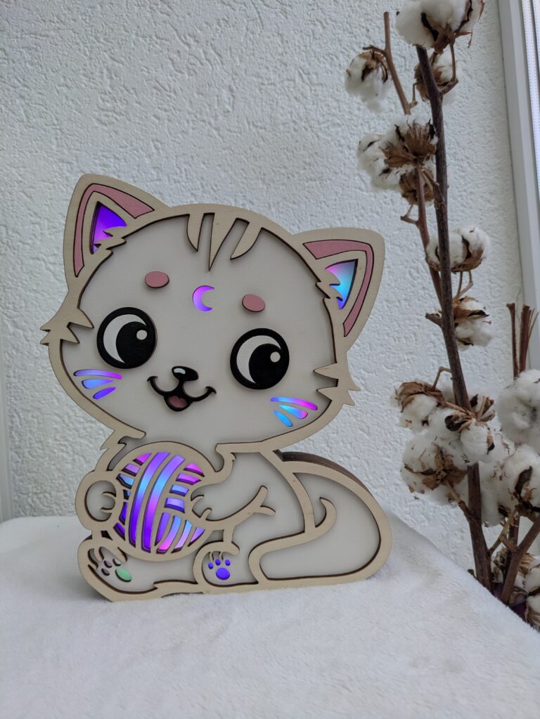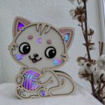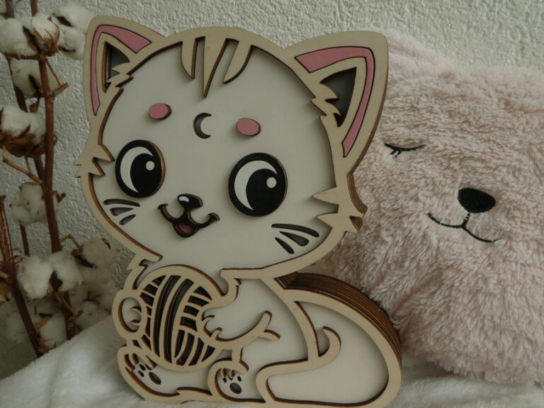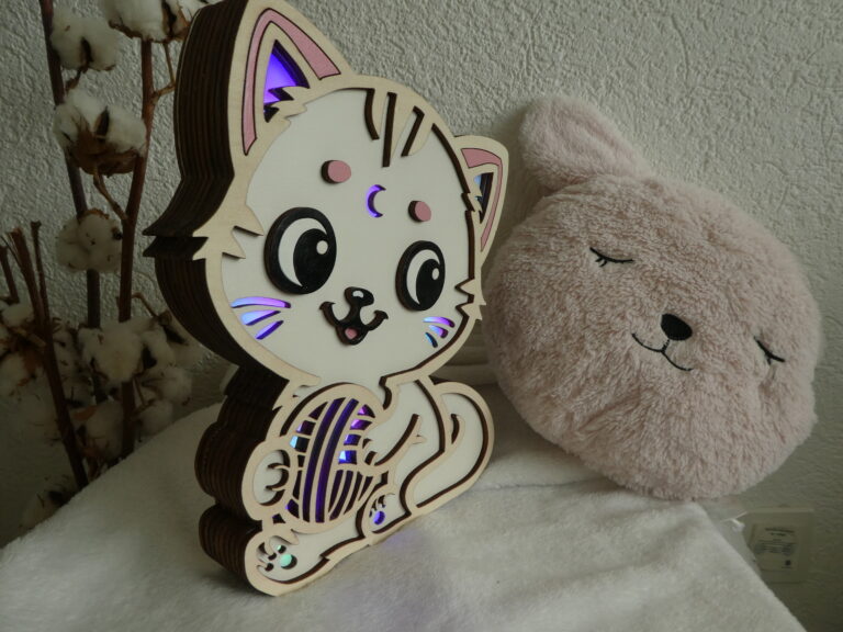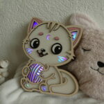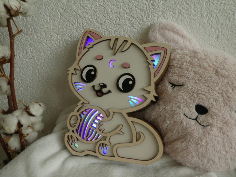 Offrez à votre enfant une veilleuse en bois unique et kawaii avec le Chat Mignon et sa pelotte. Adorable, personnalisable et sûre, elle crée une ambiance douce et réconfortante pour accompagner votre petit au coucher.
