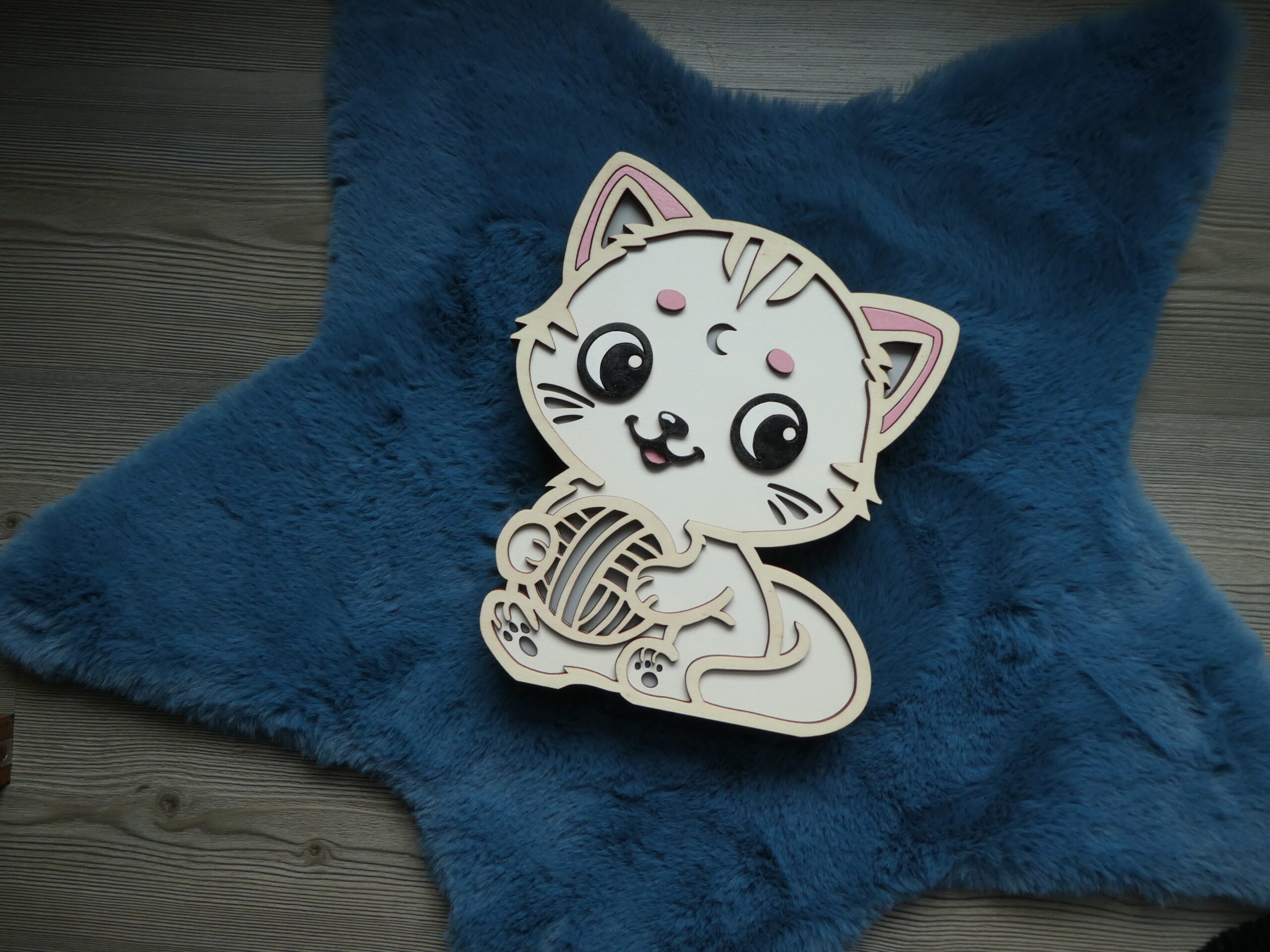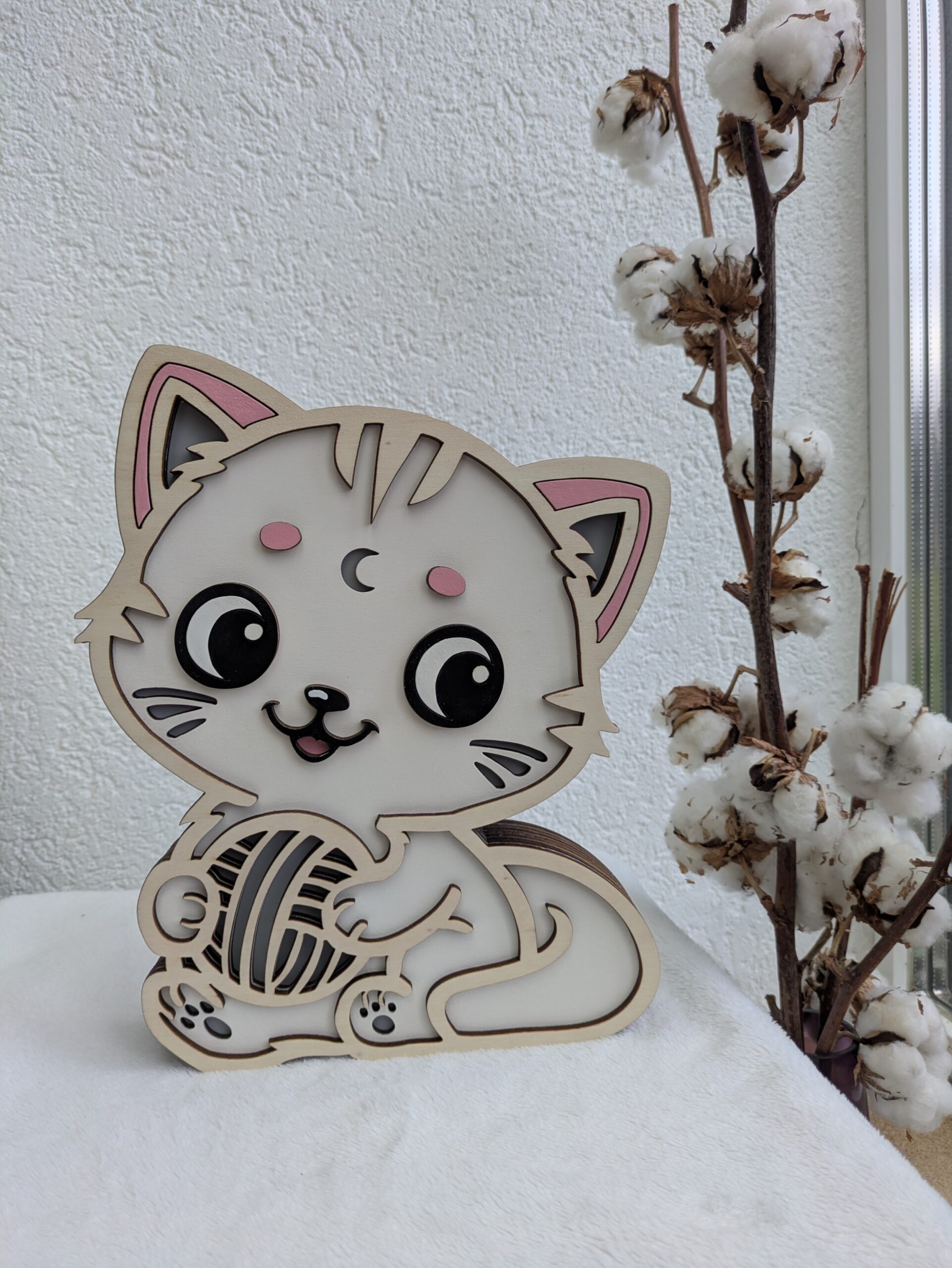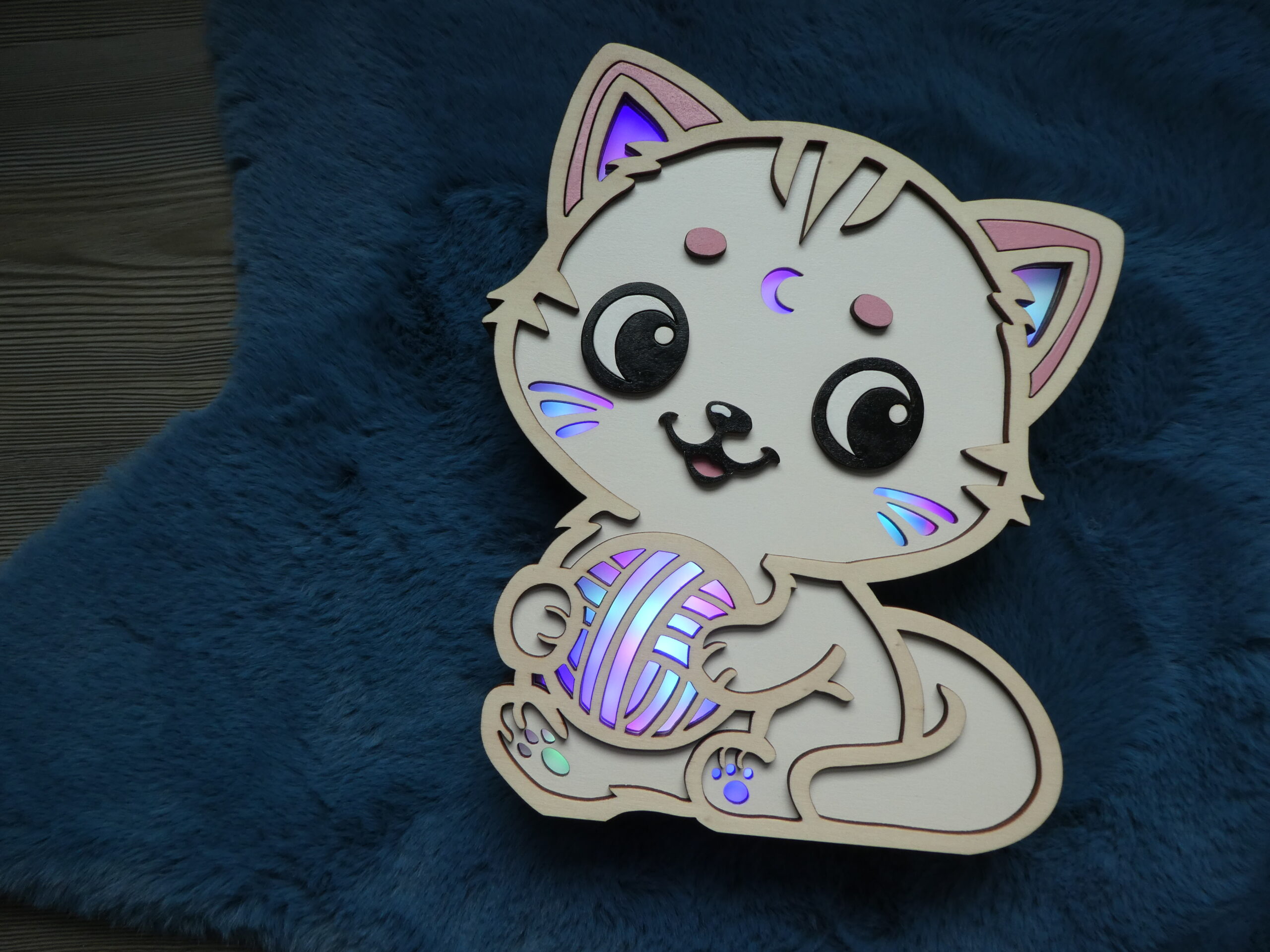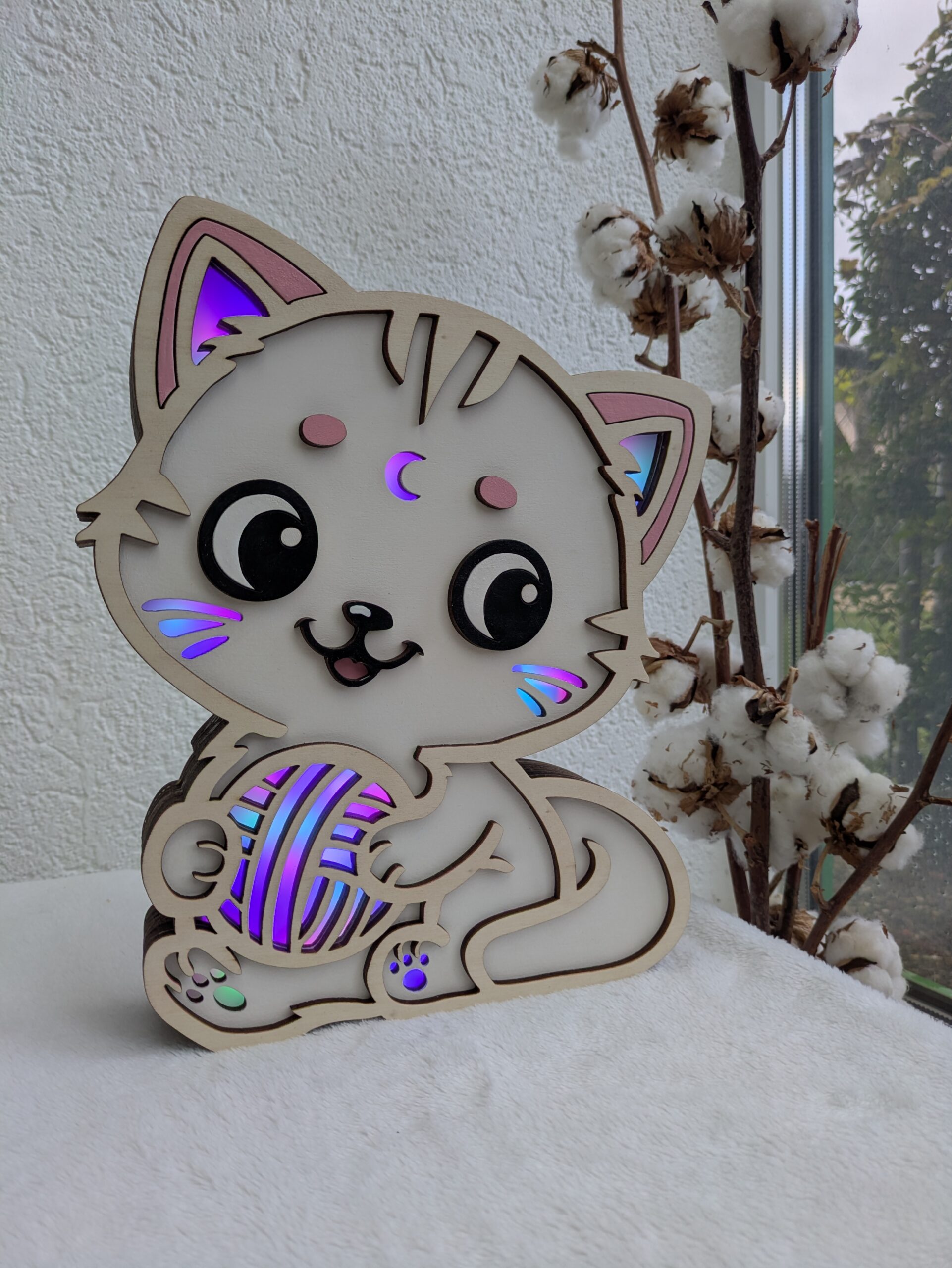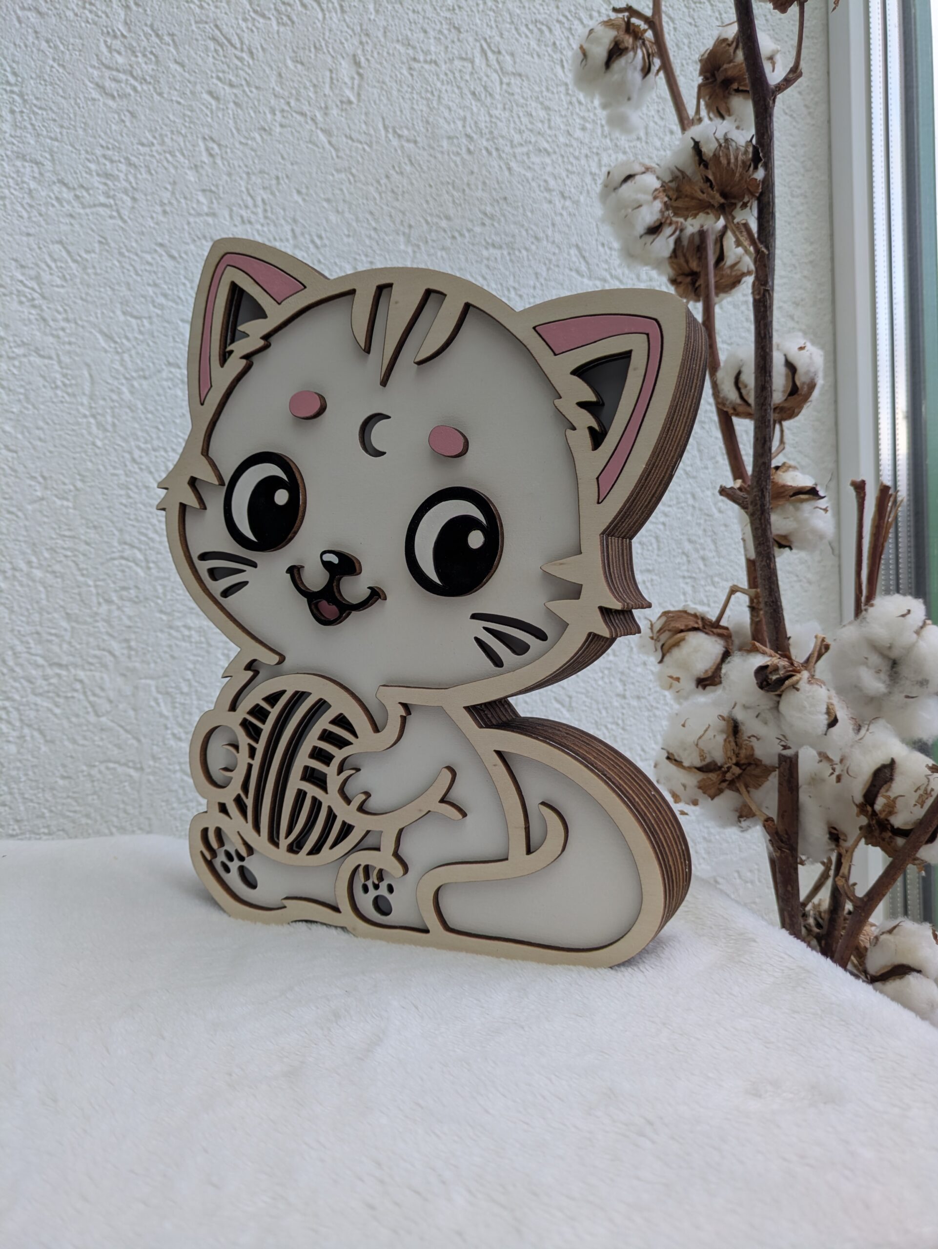 Offrez à votre enfant une veilleuse en bois unique et kawaii avec le Chat Mignon et sa pelotte. Adorable, personnalisable et sûre, elle crée une ambiance douce et réconfortante pour accompagner votre petit au coucher.