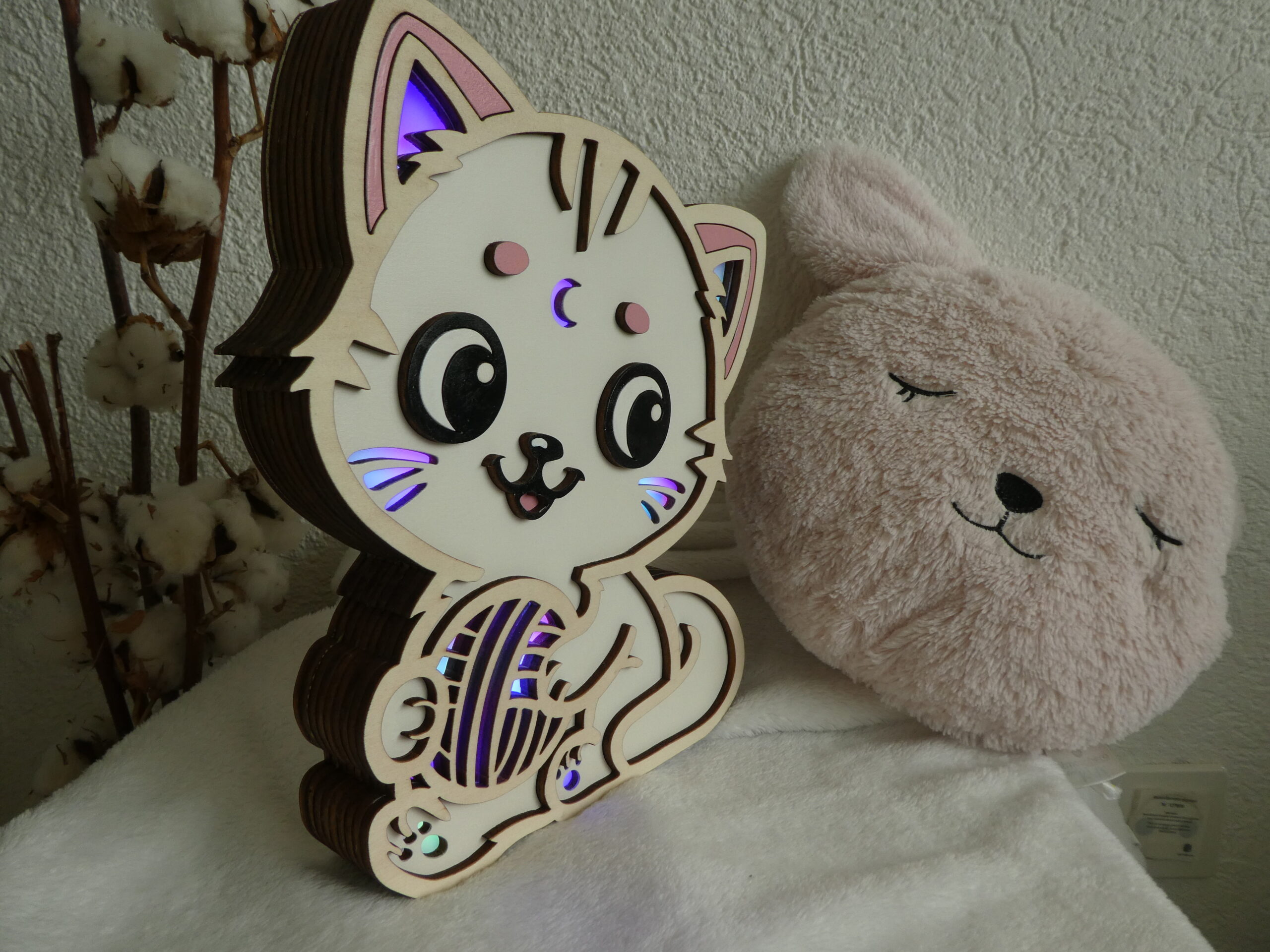 Veilleuse en bois Chat Mignon – Kawaii, personnalisable et cadeau parfait pour enfant