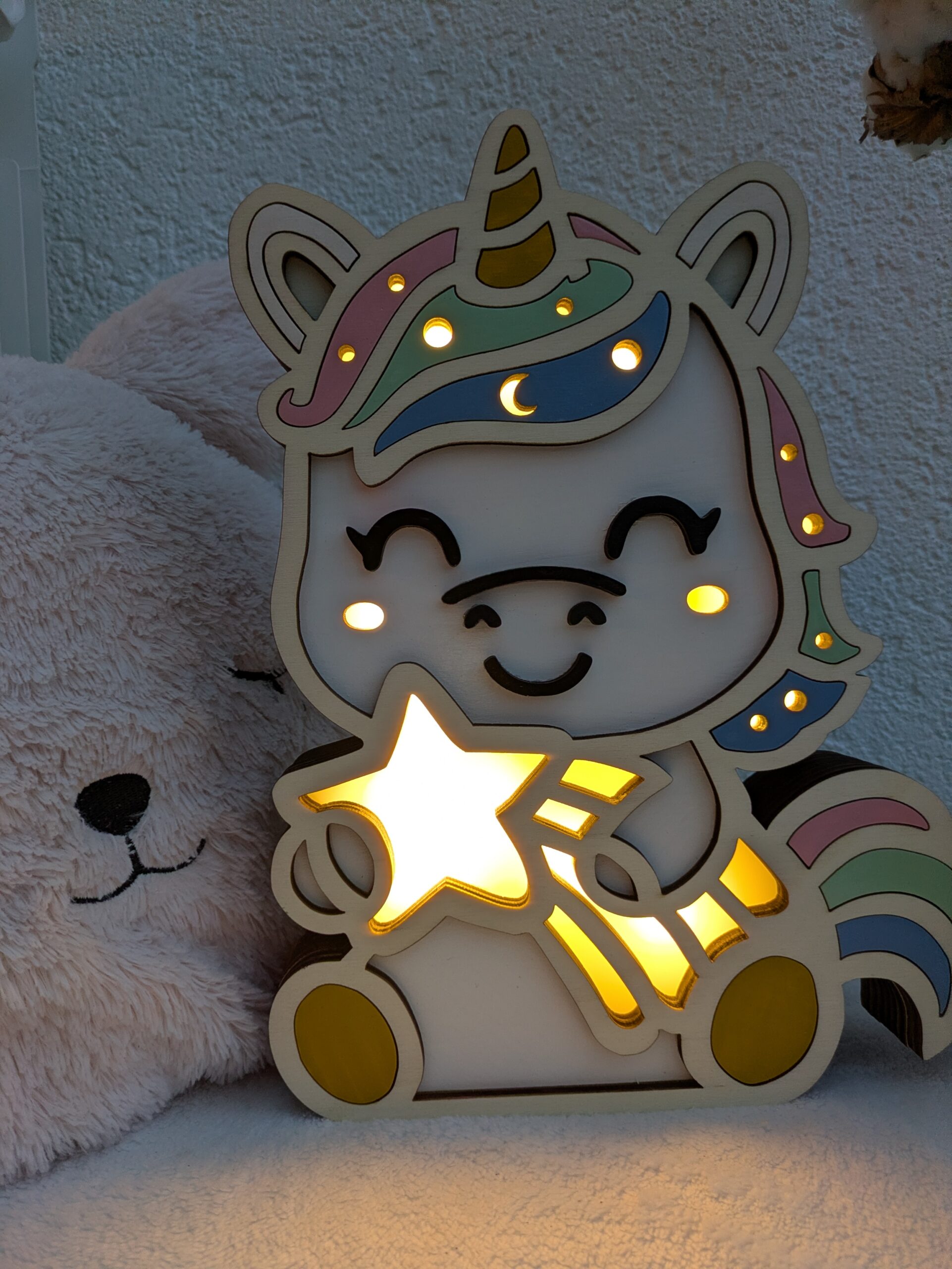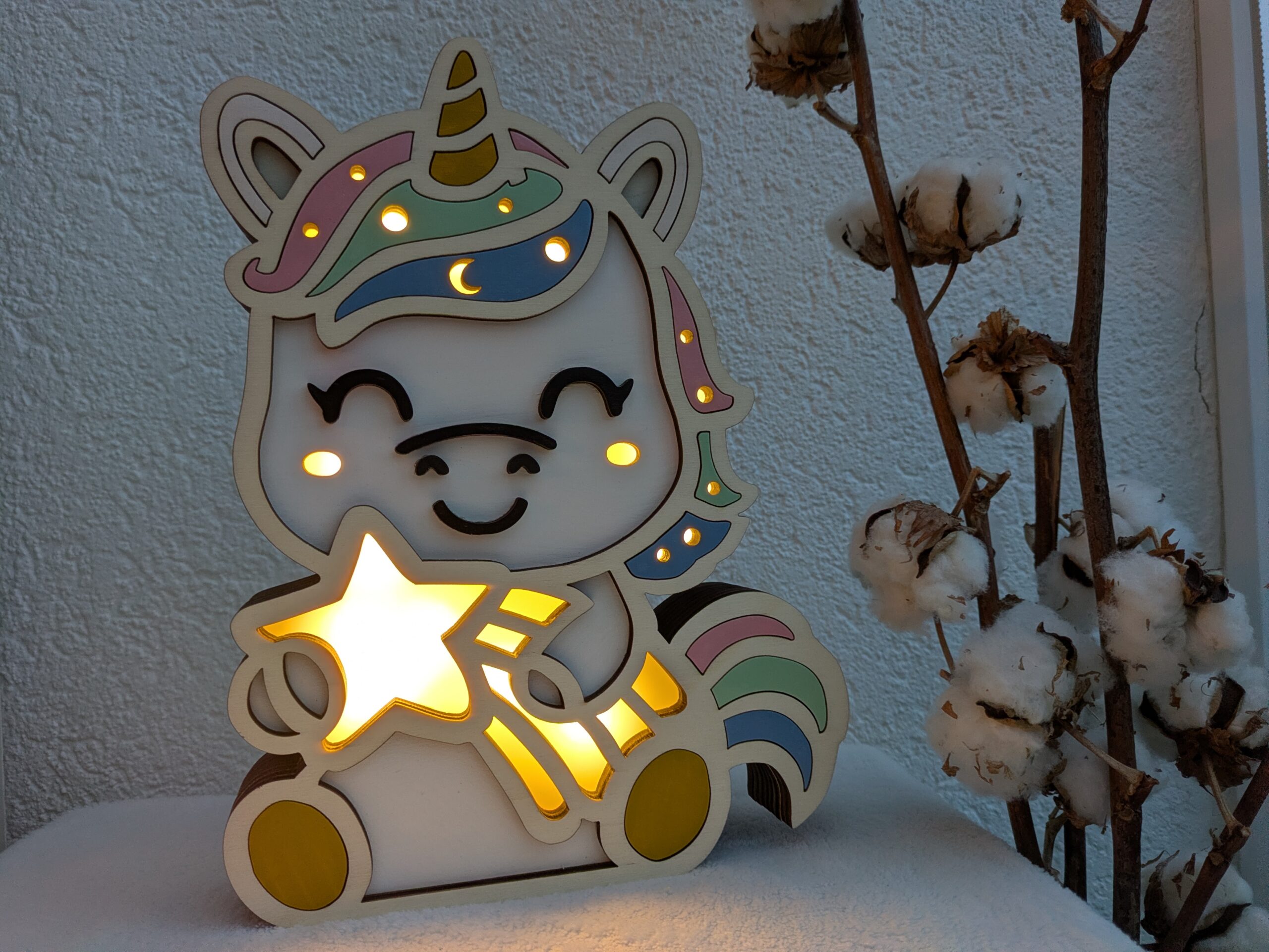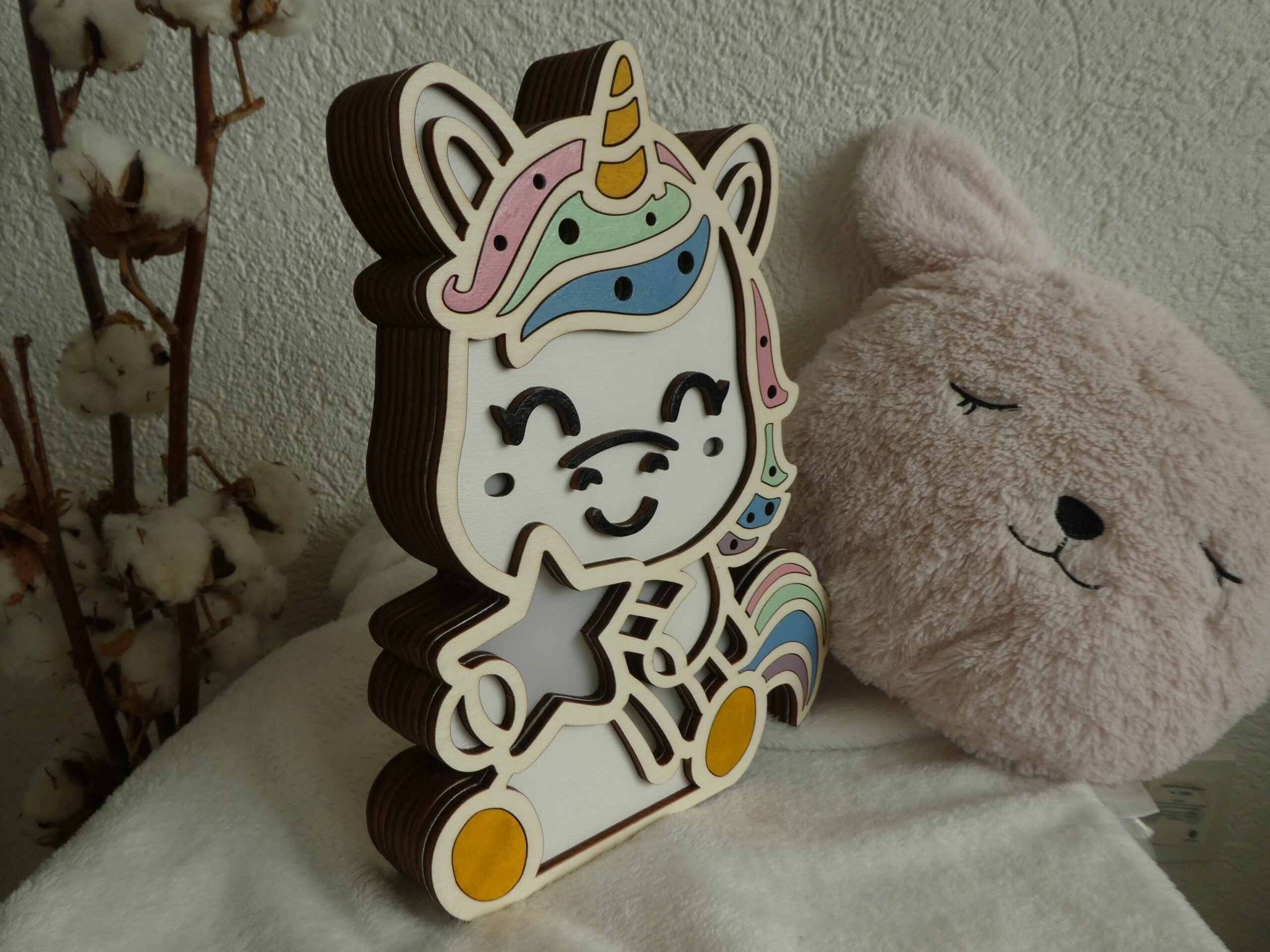 Veilleuse en bois Licorne Revêuse – Kawaii, personnalisable et cadeau parfait pour enfant