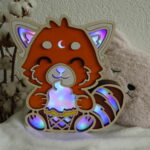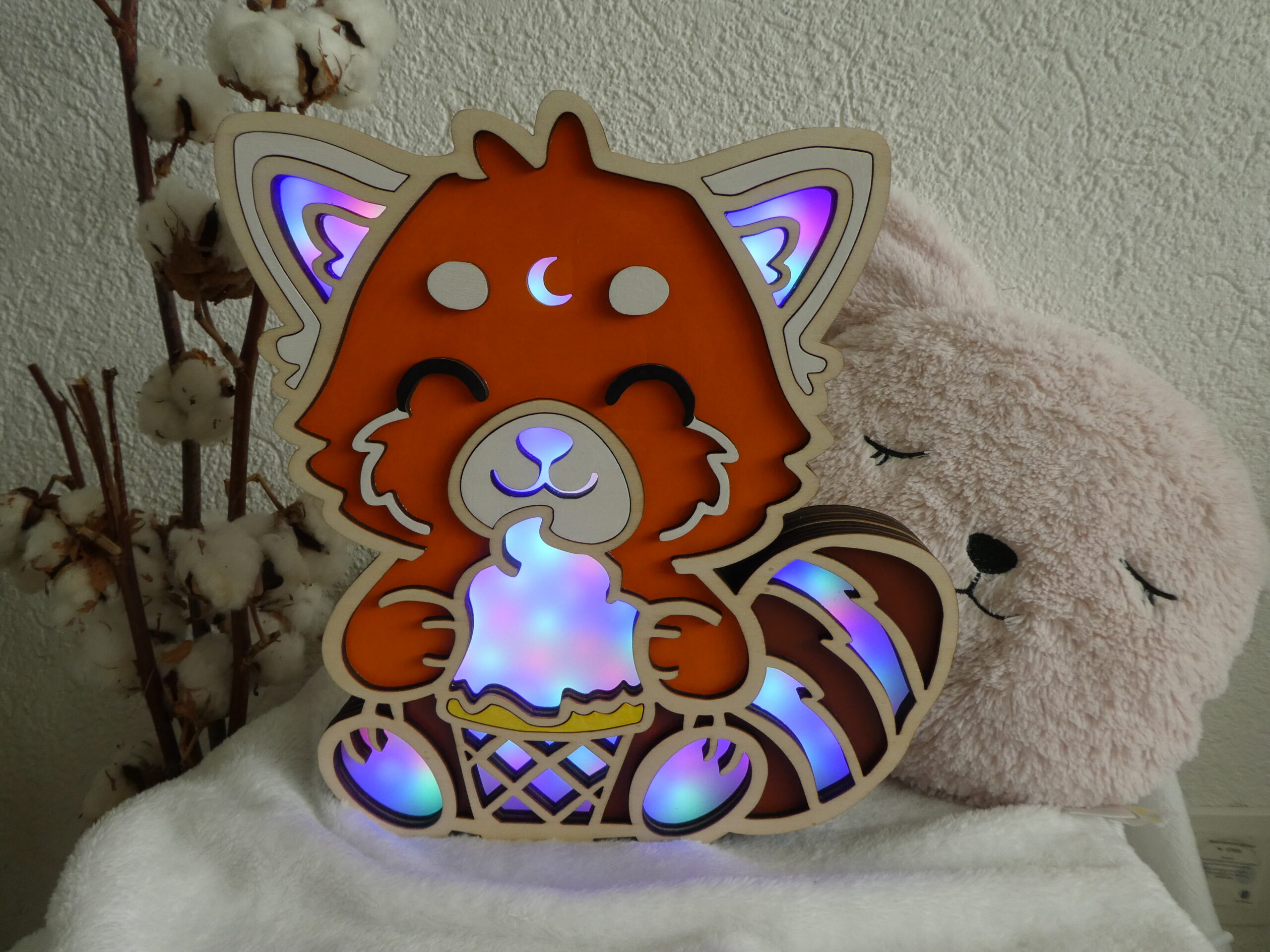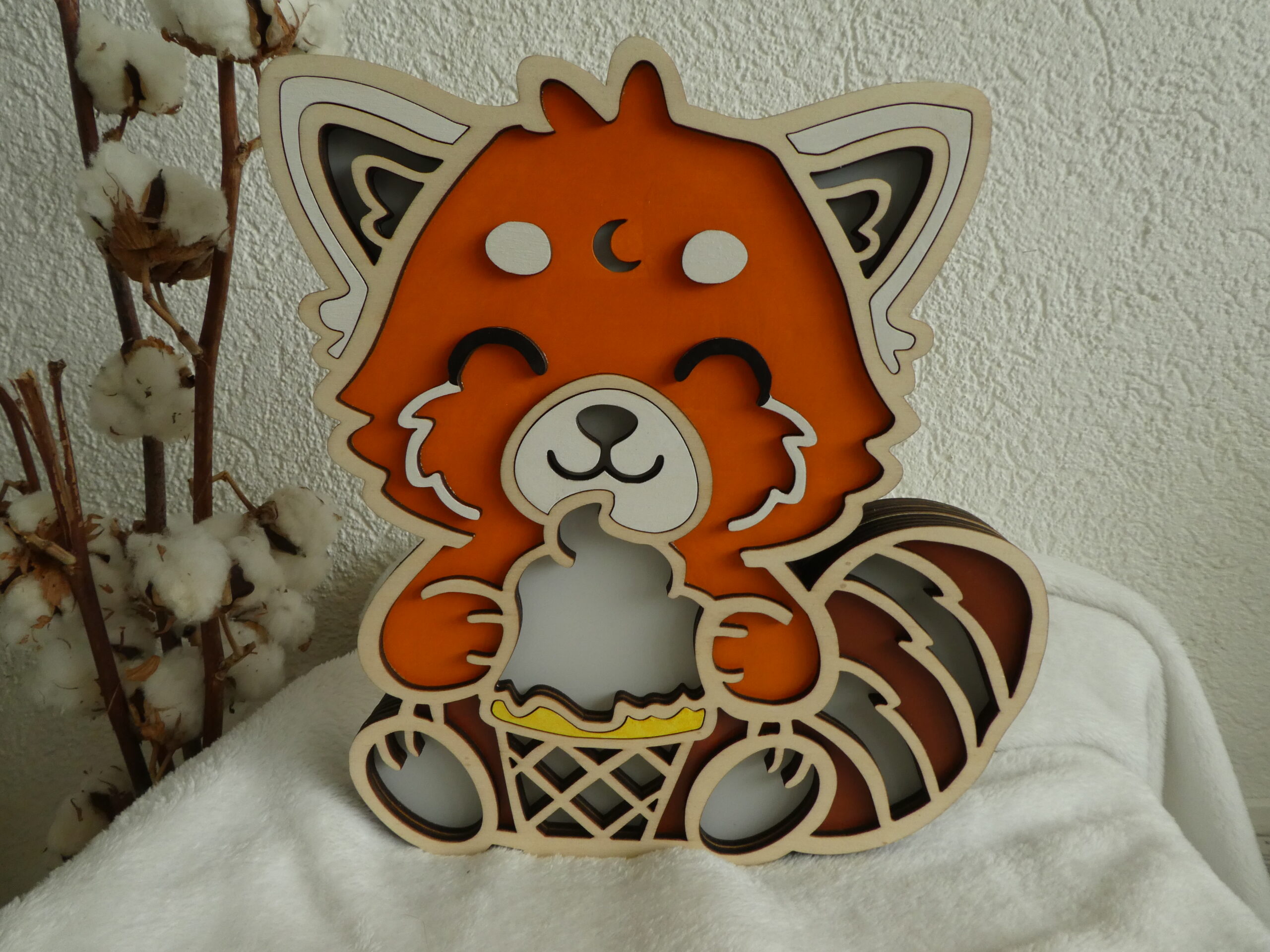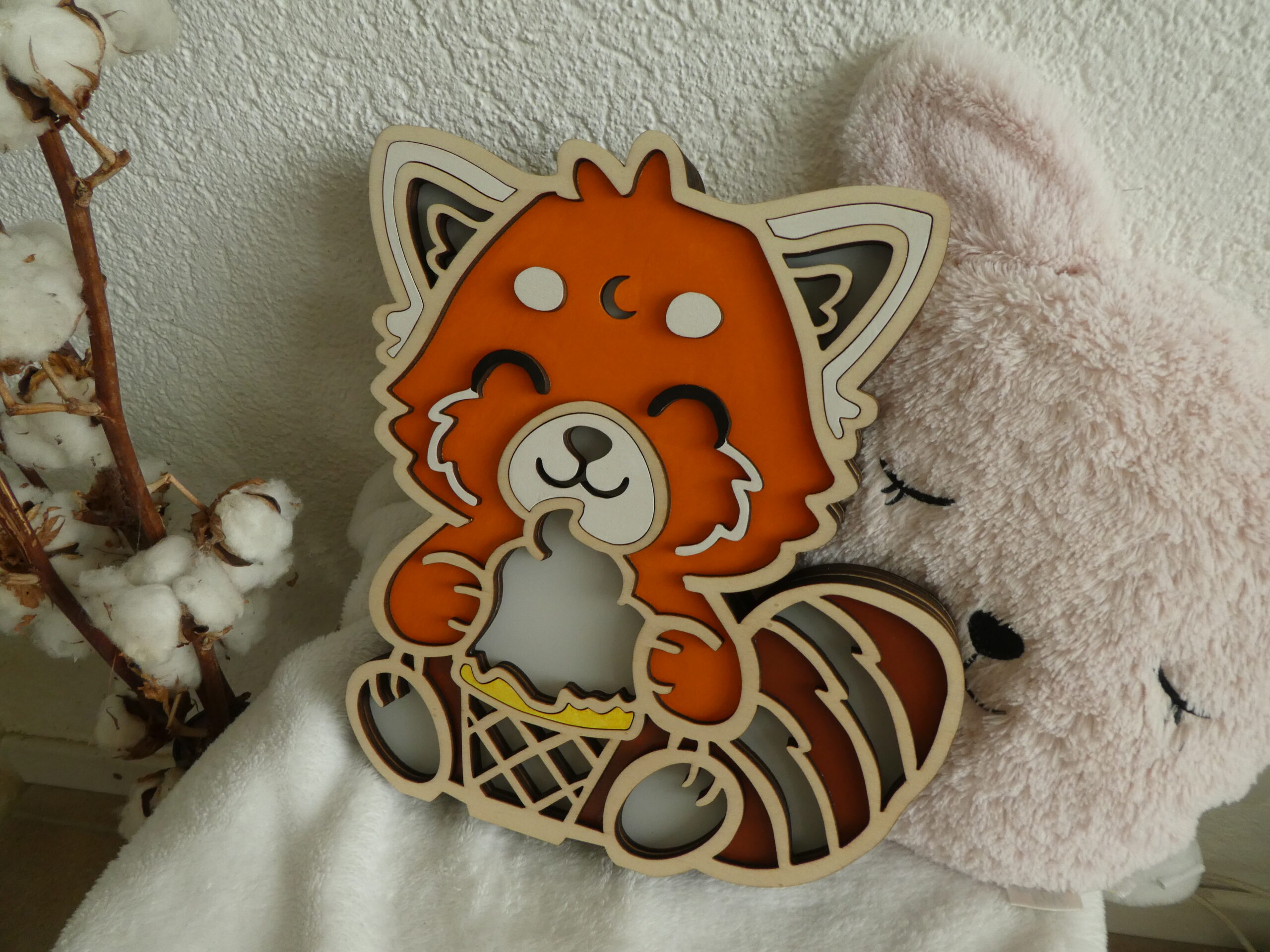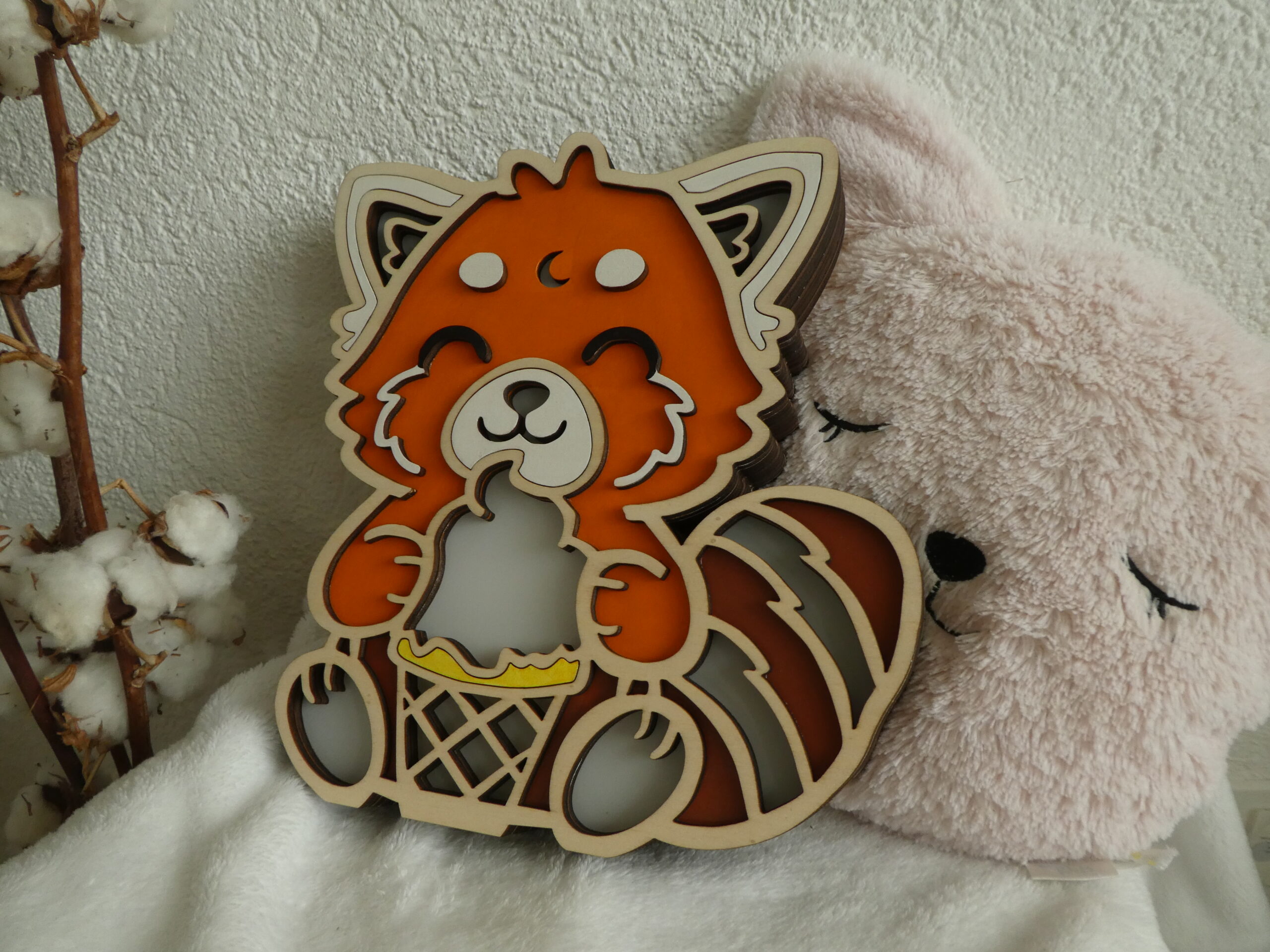 Offrez à votre enfant une veilleuse en bois unique et kawaii avec le Panda Roux Gourmand et sa Glace.