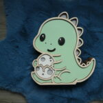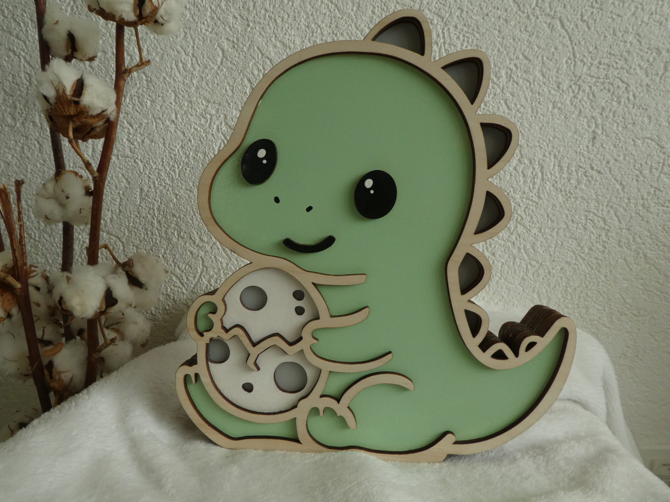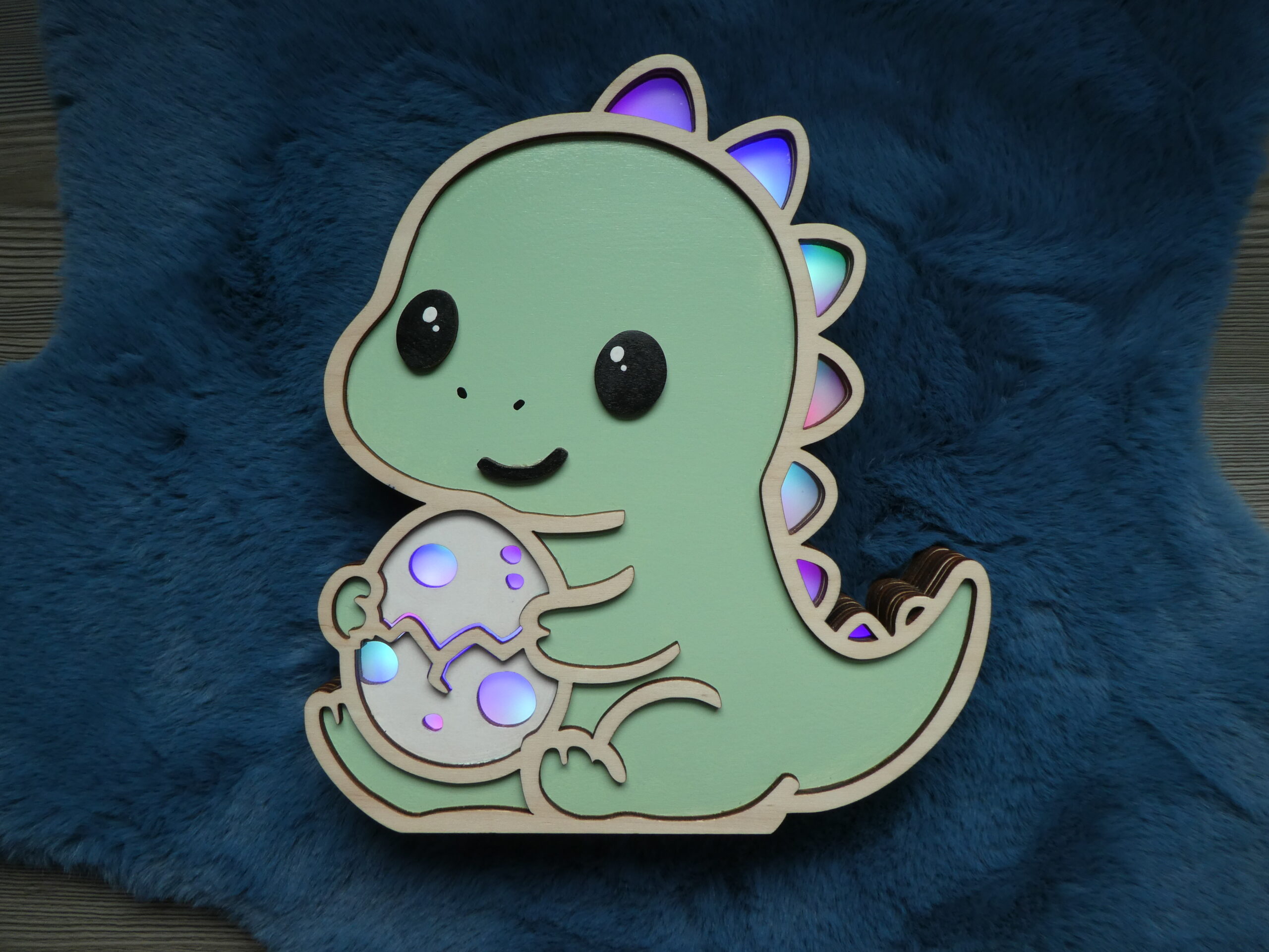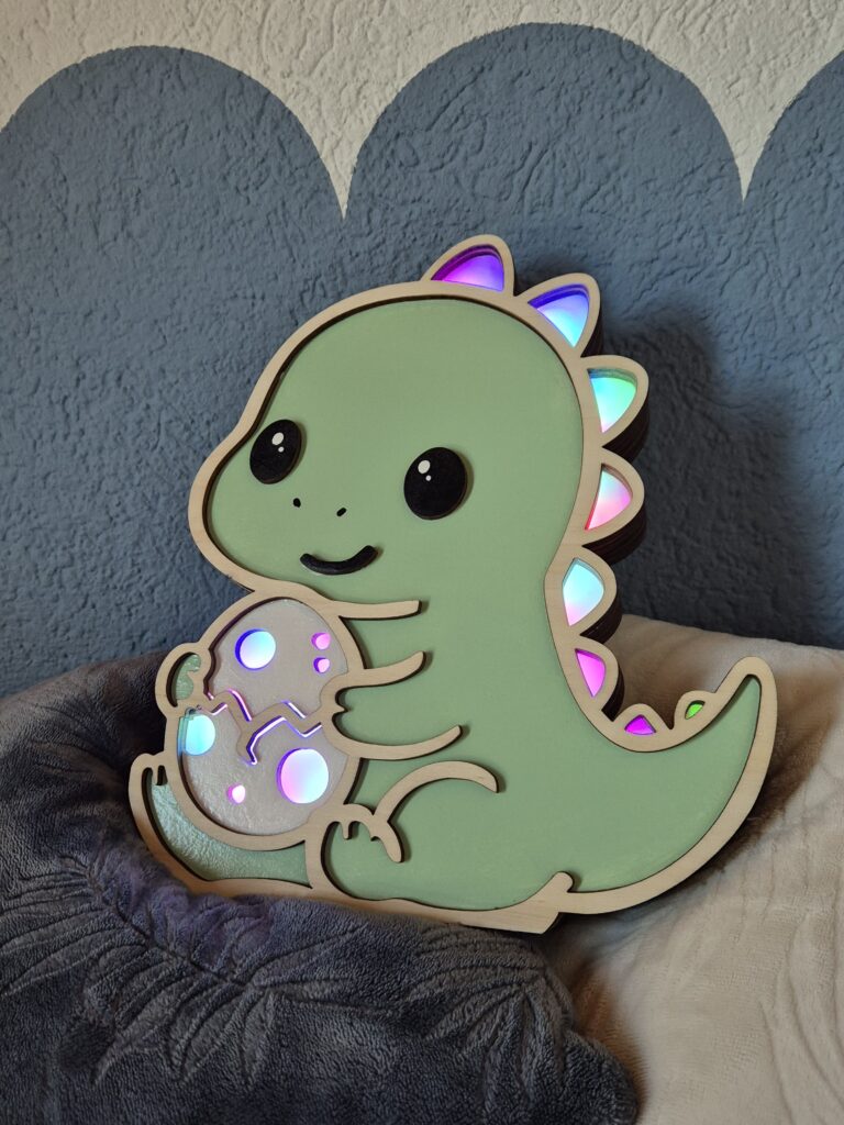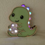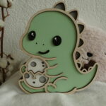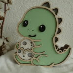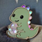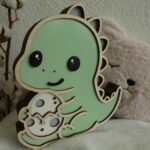 Offrez à votre enfant une veilleuse en bois unique et kawaii avec le T-rex Protecteur et son petit oeuf.