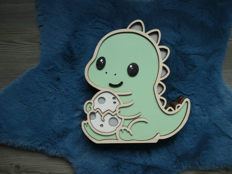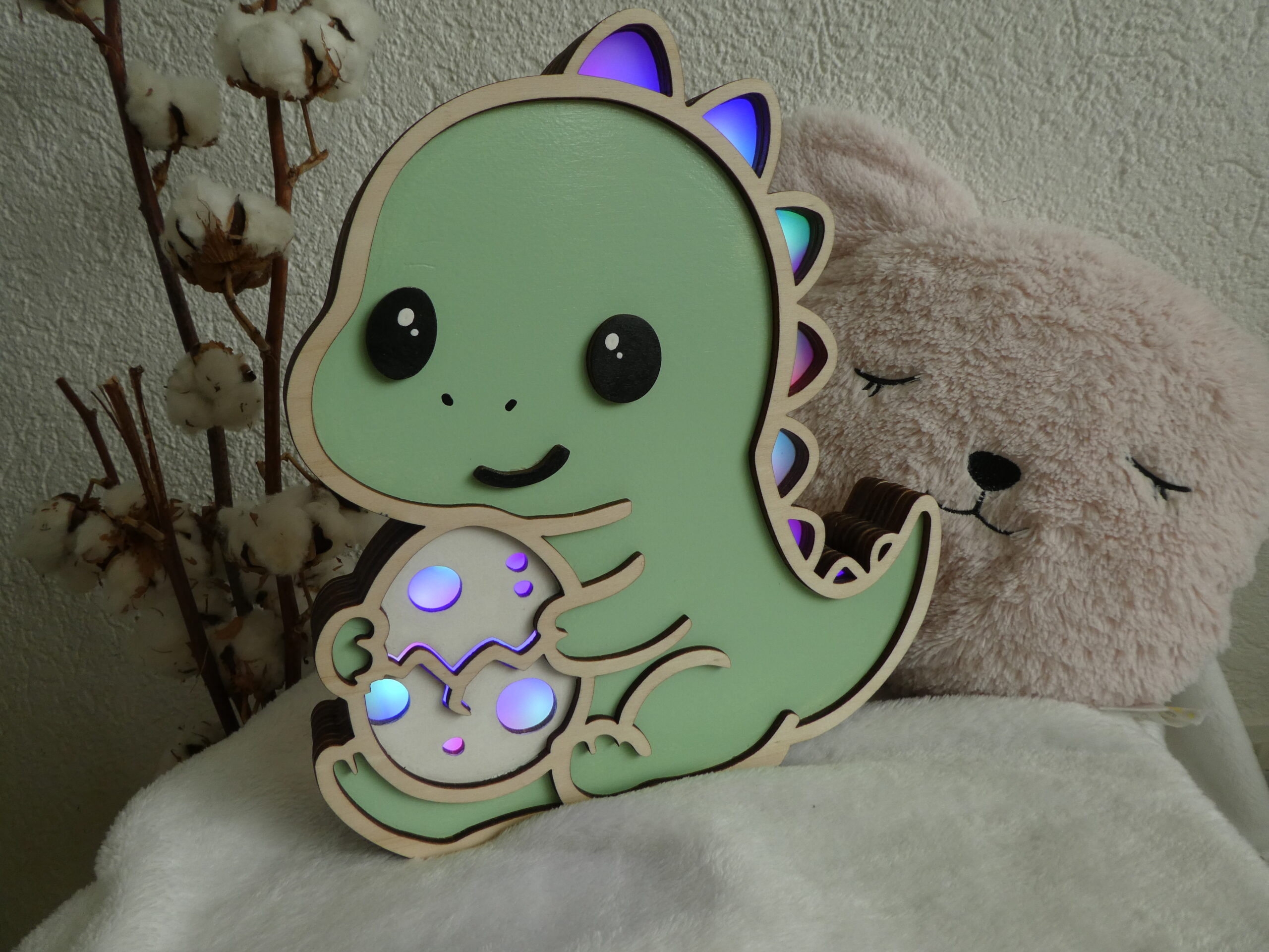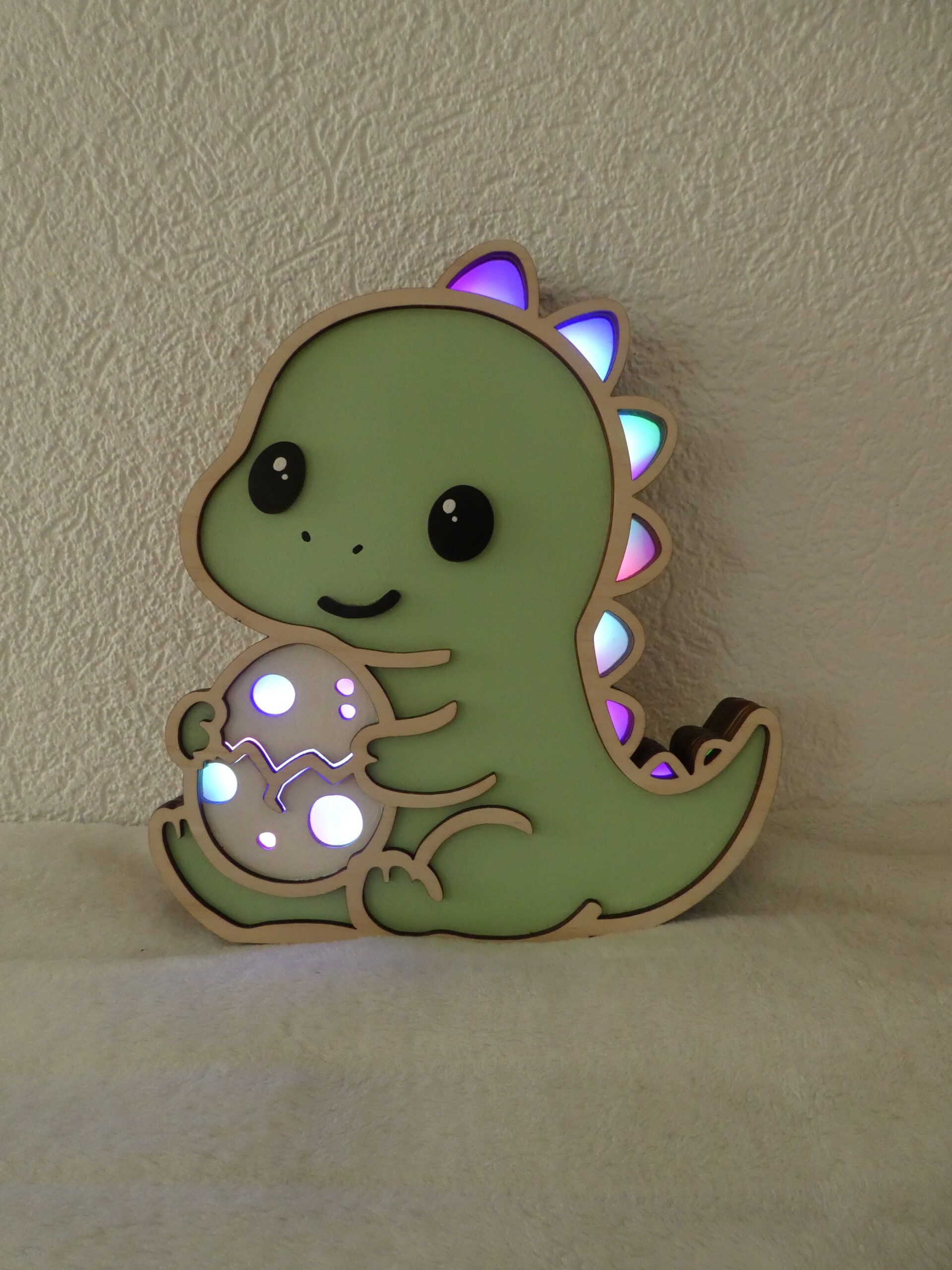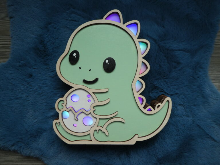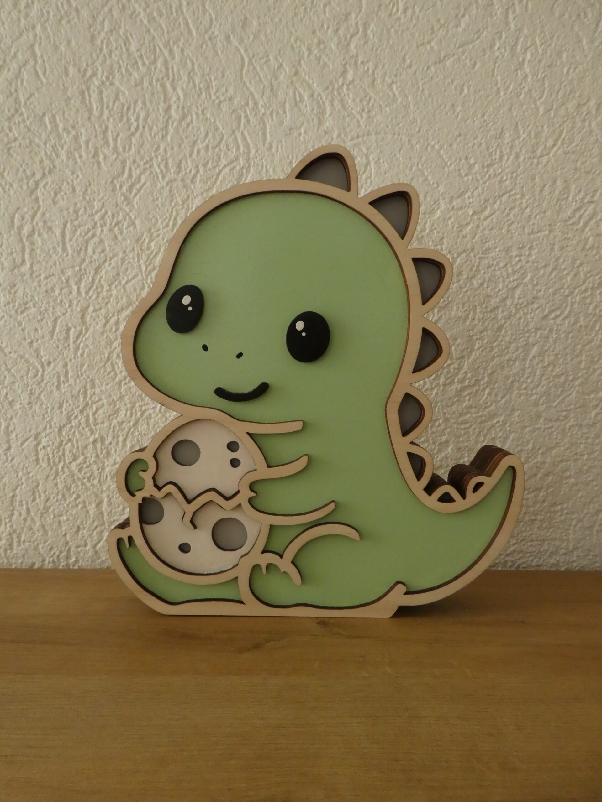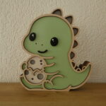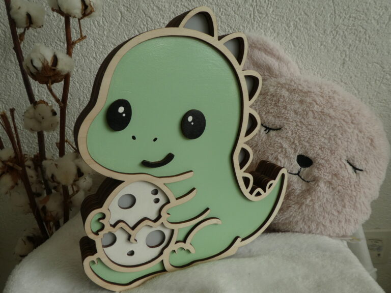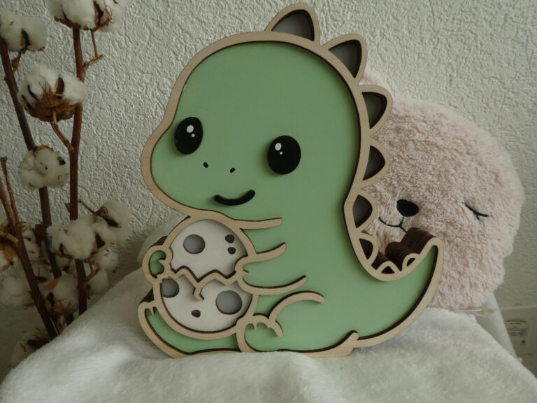 Offrez à votre enfant une veilleuse en bois unique et kawaii avec le T-rex Protecteur et son petit oeuf. Adorable, personnalisable et sûre, elle crée une ambiance douce et réconfortante pour accompagner votre petit au coucher.